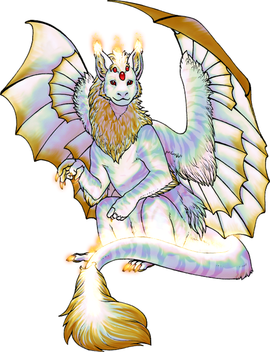 | Shapeshifting (Human-Dragon Spectrum): Chigretle can shift from her natural form to that of a human. In full human form, Chigretle's skin matches her fur colour (including the iridescence!), her hair is golden blonde, and her eyes are red. | |